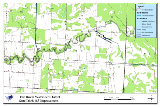 The District received a petition in May of 2002 for the improvement of SD #85. The improvement extended the ditch approximately 3/4 mile to outlet in the North Branch of Two Rivers located in the northwest corner of section 1 of Poppleton Township, Kittson County. Following a public meeting regarding the petition, the Final Engineer's report was filed with the District on October 7, 2003 and viewer's were obtained to determine benefits for the improvement. The Viewer's Report was then received on December 2, 2003. The project was approved and completed in 2004.